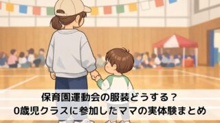 保育園の運動会で親はどんな服装が正解?1歳半・0歳児クラスの運動会に初参加したママが、当日実際に着ていた服装を体験談ベースで紹介します。動きやすさ、寒さ対策、室内履き、写真映えまで、初めての保育園運動会で迷いやすい服装選びの参考になる内容です。
